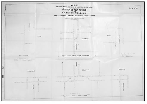 Figura 3: Trazado de cañerías de aguas corrientes en las principales esquinas de la ciudad a comienzos de siglo XX. Mendoza, 1905. Fuente: Archivo AYSAM