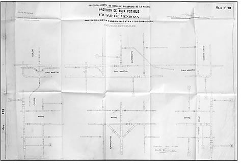 Figura 2: Trazado de cañerías de aguas corrientes en las principales esquinas de la ciudad a comienzos de siglo XX. Mendoza, 1905. Fuente: Archivo de la empresa Aguas Mendocinas. Agua y Saneamiento de Mendoza (en adelante AYSAM).