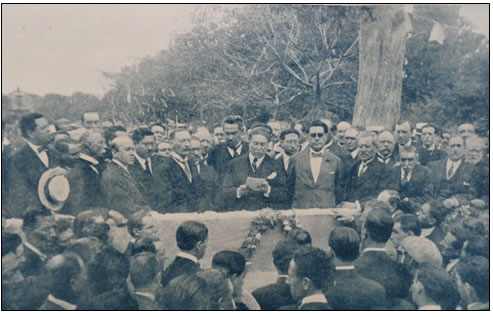 Figura 5: El gobernador Carlos W. Lencinas y la comitiva dirigente en el acto de inauguración de las obras sanitarias en la Ciudad Capital de Mendoza (1923). Fuente: Suárez, 1924.