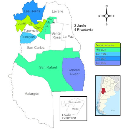 Durante el periodo lencinista (1918-1928), hubo tres gobernaciones y cuatro intervenciones federales, lo que generó una escasa continuidad de las propuestas políticas en marcha. Ello, sumado a la inestabilidad económica10 (se alternó una época de auge a la que siguió una crisis financiera) hizo que muchos de los planes ideados por los dirigentes lencinistas no pudieran concretarse o se retrasara su ejecución.